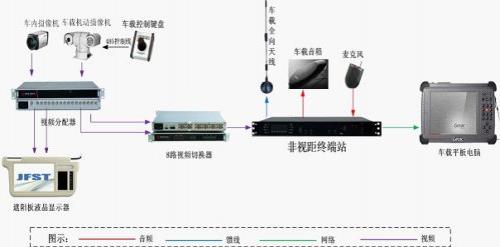 勇士机动通信车视频采集分为车内与车外两种,车外图像用于方便指挥中心对前端车辆所在位置的图像监控,并可通过车载控制键盘进行变焦、转向;车内图像用于领导会议商谈。2路图像通过一分二的视频分配器出来4路信号,2路图像接入遮阳板液晶显示器,用于本地图像显示;另外两路图像接入视频切换器,根据实际需求切换车内车外图像送到非视距传输端,由非视距终端站通过无线传输至指挥中心。
