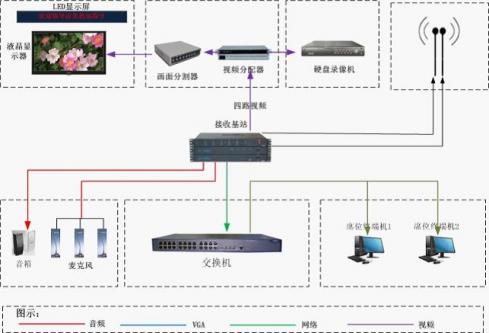 基站接收前端机动车辆的4路现场图像,从基站的解码单元输出4路图像至4进8出的视频分配器,分出的2对4路图,一对接至硬盘录像机进行存档,一对接至42寸液晶显示器用作监控、指挥、调度。