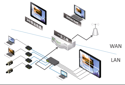 一云三端TNet是物联网拼接显示系统的一个非常有特色的扩展应用。其实现是通过将一云三端服务器连入已有的物联网拼接系统中,大屏幕所显示的整屏画面就可以由连入拼接显示内网的一云三端服务器进行抓取,并通过内置的无线路由模块与外网相连接;利用平板电脑、3G手机等终端设备连接无线路由并通过浏览器登录服务器,就可以实现对大屏幕显示画面的远程监控。