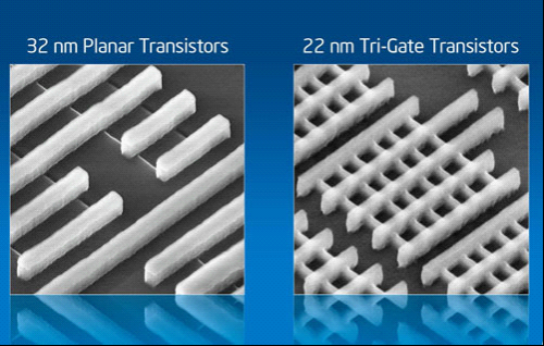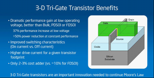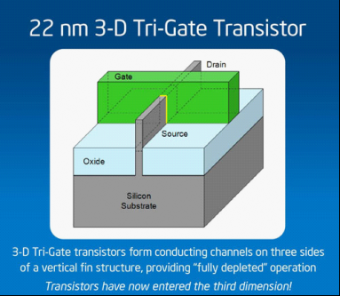 其结果是能更好的控制晶体管的开关、最大程度有效利用晶体管开启状态时的电流(实现最佳性能),并在关闭状态时最大程度减少电流(降低漏电)。与之前的平面晶体管相比,22纳米的3-D三栅极晶体管将提供前所未有的高性能和能效。与之前的32纳米平面晶体管相比,22纳米3-D三栅极晶体管在低电压下将性能提高了37%,并且只需要消耗不到一半的电量,就能达到与32纳米芯片中二维平面晶体管一样的性能。