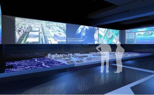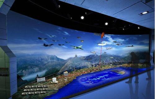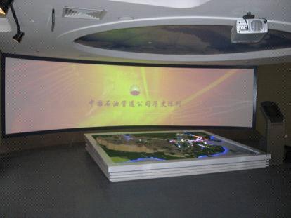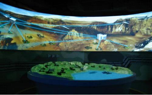 2)利用大屏幕无缝拼接融合技术,环绕实体沙盘及沙盘天花区域拼接成大型连体幕,利用高保真音响及大视野精彩视频,给参观者带来极大的沉浸感与视觉冲击力。