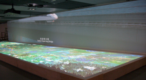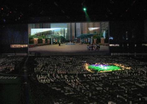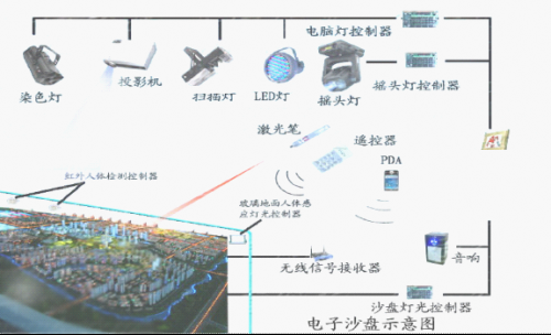 数字投影沙盘即通过投影机把计算机上的三维地形图像叠加到实体模型上。