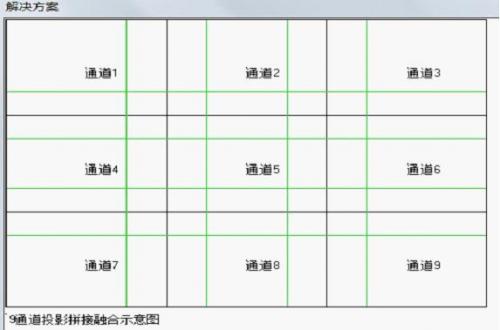 1)连体幕:本方案所采用的是横向3通道,纵向3通道的投影拼接融合。投影机选择的投射比例为4:3镜头型号为12。在投影距离为不小于389米的情况下每个投影机可以投射出324*243平米的画面。由于拼接融合的要求每个通道之间都需要留出通道本身分辨率至少1/8的分辨率用于融合,经过几何矫正以后投影面积(幕的面积)为8*608平米。