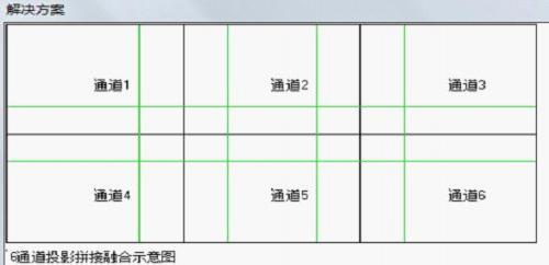 2)塑模沙盘投影:本方案所采用的是横向3通道,纵向2通道的投影拼接融合。投影机选择的投射比例为4:3镜头型号为08。在投影距离为不小于383米的情况下每个投影机可以投射出479*36平米的画面。由于拼接融合的要求每个通道之间都需要留出通道本身分辨率至少1/8的分辨率用于融合,经过几何矫正以后投影面积(幕的面积)为12*639平米。