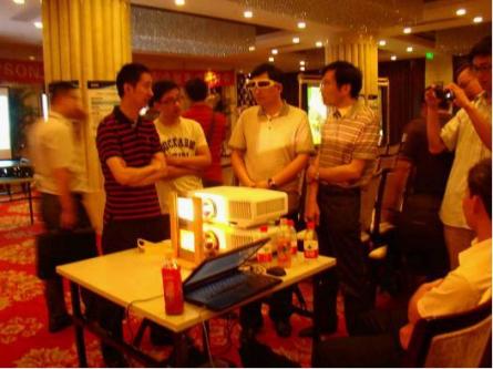 3D投影方案由2台5200流明的爱普生EB-C520XE,1块100英寸4:3的3D投影幕、1套立体成像系统和若干立体眼镜组成。首先将3D视频信号分为两路,通过线缆分别传输到两台垂直叠加的EB-C520XE投影机上,两台EB-C520XE同时投影一幅影像,一台投影右眼影像,一台投影左眼影像,再通过被动立体眼镜左右眼的线形偏振极化镜片,实现真实的3D立体投影效果。