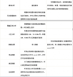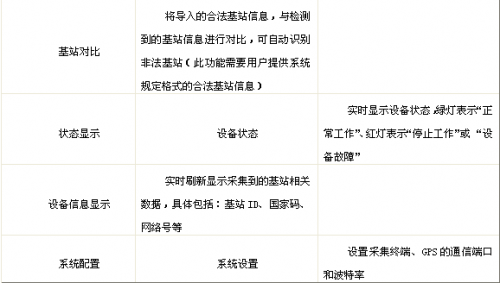基站ID监测系统基本的功能是对中国移动GSM和TD-SCDMA网、中国联通GSM和WDMA网以及中国电信CDMA20001X和CDMA20001X EVDO网的基站参数采集监测、基站数量统计以及基站地理位置分布。为方便用户使用,本系统还增加了多种基站查询方式,如:通过监测时间查询,测试经纬度范围查询以及通过位置区域码查询等。同时用户还可以通过本系统方便的进行数据库操作,如:导入数据、导出数据等。系统主要功能描述如下表所示: