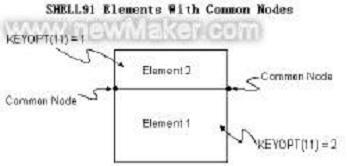 这种单元类型还有一个特点就是可以对同一个节点定义两种材料属性。对夹芯复合板来说,蒙皮和夹芯粘接处为两种材料属性,却具有相同的节点,所以这个功能对夹芯复合板非常有用,如图18 所示。这种功能的属性可以通过ANSYS 的KEYOPT(11)来定义。