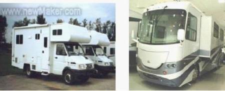近几年随着人们物质生活水平的提高和旅游业的发展而迅速撅起的房车产业,在很多技术上应用了军用厢式车的技术成果,从车厢与底盘连接技术、车厢的扩展技术到车厢的结构材料等,这些技术促进了房车产业的发展,同时也促进了旅游业的发展,给人们的生活带来了更便利的交通工具和更舒适的旅游空间,提高了人们的物质文化生活水平,如图20 所示,在汽车二类底盘上改装的自行式房车和图21所示的在大客车车身基础上改装的可扩展式房车。在运输行业里,部分民用厢式运输车如食品冷藏车、食品保温车、保鲜车等也在很大程度上应用了军用厢式车的技术,促进了该行业的发展。在和平年代时,军用技术越来越多的应用于民用工业,带动民用工业的发展,这是一种必然趋势。
