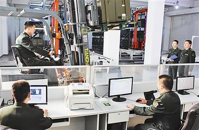 “准备收料!”仓库保管班班长谭福新一声令下,中士王雄迅速用身份识别卡打开门禁系统,库房内照明灯、LED屏等设备瞬间自动开启。
