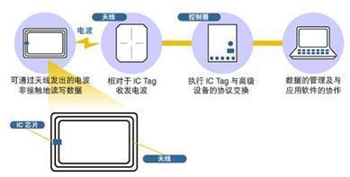 RFID系统由“RFID电子标签(RFID Tag)”、“读写器(天线+控制器)”、“PC等高级设备”这三要素构成。“RFID Tag”由可保存大量数据的IC芯片及天线构成,根据“PC等高级设备”的指令,保存在RFID芯片中的数据可由“读写器”读取或擦写。