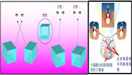一般而言,立体显示器必须具有两眼视差(Binocular parallax)及移动视差(Motion parallax)的特性[1],如下图所示。所谓的两眼视差是指观赏者的左眼及右眼有在水平方向约6.5公分的位移(欧美人士的统计结果),故在观看物体时,由于观看角度略有不同,因此,所接收的影像内容也略有差异。而移动视差则是指观赏者的眼睛位置移动时,由于观赏角度也随之改变,眼睛所接收的内容也有所不同。所以若我们要接受到立体的影像,也就是我们要如何让左眼与右眼分别只接受到有些微差异的个别影像。