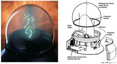 德州仪器(Texas Instrument, TI)提出一种利用雷射扫描立体影像显示器,又有人称之为体积式显示器。主要是利用一个快速旋转的圆盘,配合由底下投影的雷射光源,藉由雷射光源投射到快速旋转的旋转面时,会产生散射的效应,以扫描空间中的每一点,其缺点是影像中央必须有一个旋转轴,靠近轴心的影像旋转速度较慢,立体影像较不清晰。