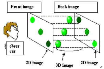 日本NTT提出一种利用两个重叠的液晶面板,在两个面板显示大小相同的影像,利用物体离观赏者的远近距离不同,会有阴暗及颜色上的差别,进而将前后物体影像重叠在一起,让观赏者产生立体感,其缺点是前后面板的对位困难,且因为是由两个二维影像重叠的结果,所以只有在正视方向观赏,立体效果较佳,其余观赏角度则不易显出立体效果。