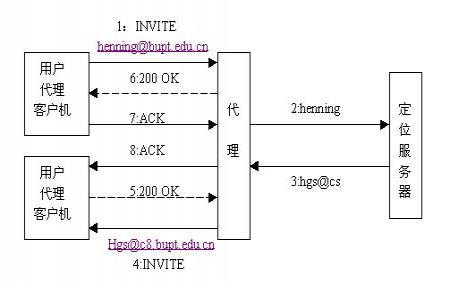 SIP在设计上充分考虑了对其它协议的扩展适应性。它支持许多种地址描述和寻址,包括用户名@主机地址:被叫号码@PSTN网关地址:Tel:010-62281234普通电话的描述等。这样,SIP主叫按照被叫地址就可以识别出被叫在传统电话网上的位置,然后通过一个与传统电话网相连的网关发起并建立呼叫。SIP最强大之处就是用户定位功能。SIP本身含有向注册服务器注册的功能,也可以利用其它定位服务器DNS、LDAP等提供的定位服务来增强其定位功能。通过SIP代理建立呼叫的例子如下图所示:
