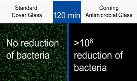康宁还展示了下一代屏幕玻璃的抗菌功能。康宁介绍,在半小时的时间内,自己的屏幕就能杀死一大堆的细菌和病毒;而在两小时之内,所有有害的细菌和病毒都会被杀光。