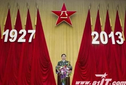 节日的人民大会堂宴会厅灯火辉煌,洋溢着喜庆气氛。主席台帷幕中央悬挂着巨型“八一”军徽,两旁是十面鲜艳的红旗。“1927-2013”几个醒目的大字,昭示着中国人民解放军走过了86年的光辉历程。