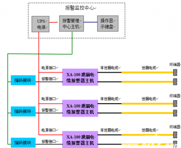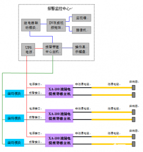 泄漏电缆主机报警后输出一对常闭开关量信号,连接编码地址模块,通过信号线传送到监控中心的报警管理主机上,操作显示键盘显示出具体的报警防区号,整个系统的供电电源采用集中供电的方式,通过符合要求的电源线把电能输送给前端的每台泄漏电缆主机上。