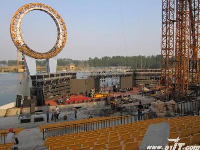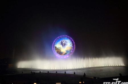 在银基文化产业园广场,巨大的水池中央,总直径35米,高46米的钢结构立体O形圈,矗立于水面之上,户外看台设置1万席贵宾座位。当夜幕降临,音乐响起,O形圈内将瞬时布满6重水帘,与水池内两个20米高、40米宽的水墙组成自地面到空中的壮观水幕。