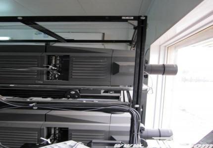 10台科视Roadie HD+35K投影机,安装在60米远的机房,以背投的方式,3台叠加,共两组,投射中间巨型O型水幕,另外2台叠加,共两组,投射两侧水墙。科视Christie HD+35K投影机采用3片DLP技术,具有35000流明亮度,2048 x 1080的2K分辨率和10位图像处理,可以提供清晰、明亮的高品质图像,满足大型水幕投影对亮度、清晰度的严苛要求。