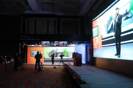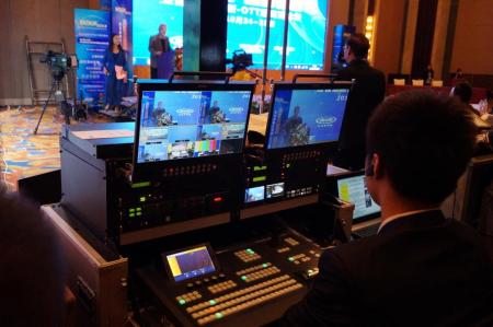 “美视全媒体演播室”为来宾演示全媒体虚实结合的“真彩美视界”。唯美的场景,严谨的布局,主持人演示屏幕同步播出,将虚实穿插、氛围渲染等特效功能演绎得淋漓尽致。移动导播核心设备—datavideo MS-3000 8/16路HD-SDI移动演播室成为令人瞩目的亮点。同时配合3台高清摄像机松下PX 3100进行拍摄,以及搭配大洋非编和播出设备同时进行视频调度,并且将视频信号输出到会场大屏幕以及外部录制系统中。MS-3000秉承了洋铭设备一贯的简单操作和运行稳定等特点,完全无故障及问题出现。