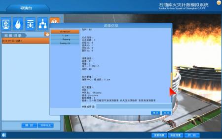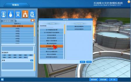 系统可预置4种不同类型的场景,训练导演可在4种场景之间自由选择和设置,设定虚拟训练场景的天气条件,包括雨量大小,风力大小及风向。在虚拟训练场景中添加火点,并设置火点参数,包括设置火点的类型、大小以及所在位置等。对罐体与消火栓进行参数设置后,训练导演对系统中的培训人员进行角色分配,控制各中队的出动顺序及装备配置内容和数量。