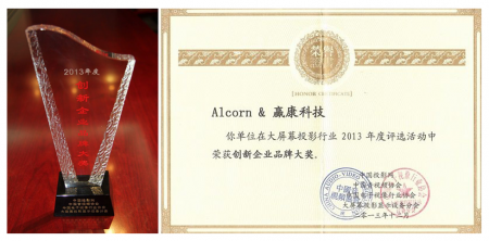 近日,由中国投影网、中国音视频协会、北京电子视像行业协会、大屏幕投影显示设备分会共同举办的 “大屏幕投影行业2013年度评选”活动中,Alcorn和赢康公司获得“创新企业品牌大奖”。