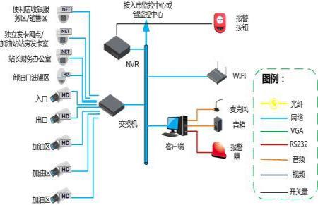 加油加气站安防系统建设,目的是实现对加油加气站进出车辆情况、收费情况、设备运行情况、加油加气站工作情况、站房内销售情况以及财务室情况进行实时监视,并能实现实时应急报警、语音对讲及广播。