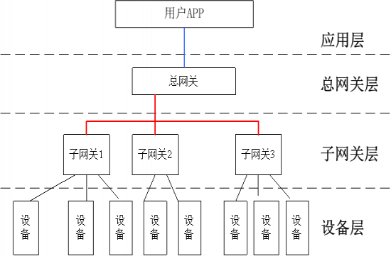 整个系统分为四层,分别是设备层、子网关层、总网关层和应用层,如下图所示。