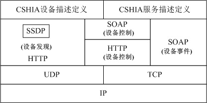 《中国智能家居产业联盟互联互通技术规范》以UPnP规范为核心,是一个基于文本的应用层控制协议,独立于底层传输协议TCP/UDP,用于实现不同厂家之间智能家居的设备发现、设备控制、事件通知等,如下图所示。