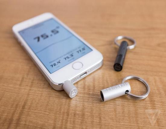 Thermodo作为一种手机配件,可以通过插到智能手机的耳机插孔中获取环境实时温度。准确来讲,Thermodo是一种手机配件,它出自知名天气预报应用Haze的开发者Robocat之手。它可以插到安卓手机或者iPhone手机的耳机插孔,并在与之匹配的APP的协助下让智能手机实现即时读取环境温度的功能。Thermodo内建高度敏感的传感器,无论用户是身处寒冷的雪山顶峰,亦或是在大汗淋漓的桑拿房,Thermodo都能让你的手机读出准确的环境温度。