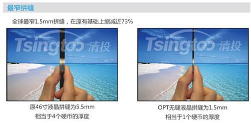 虽然液晶的发展先后经历了宽边到超窄边的进步,但是相对于DLP的拼接效果,46寸液晶的5.5mm拼缝也并非最理想的显示效果。清投视讯立足为客户开发更好的产品,在液晶拼接屏领域不断地研发新技术,采用最新独创的OPT技术,打造了无缝液晶拼接系统,奇迹般地将46寸液晶的拼缝缩减4mm,降低至1.5mm。液晶拼缝由原来4个硬币的厚度降低至一个硬币的厚度,解决了液晶拼接多年来无法处理的拼缝问题,极大地提升了液晶拼接屏的显示效果。