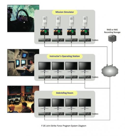 DGy产品被安装在F-35的多个飞行员驾舱中,使用来自影像发生器的直接馈入信号和视频摄像机来记录飞行员在机动飞行期间观察到的一切事物,包括航空电子设备、窗外的影像、目标获得、导航情况和武器控制。在教官的操作员站(IOS)和行动后回顾设施(AAR)中采用了备用的DGy单元。在整个模拟器内,DGy解码器同时对任务模拟进行流处理和记录,使任务模拟流到RGB Spectrum的多点传送视频服务器(MVS)上进行集中保存和录像管理。在任务模拟后,在任务报告设施中采用的DGy编解码器可以回放模拟结果,从而可以对飞行员的表现情况进行评估。DGy编解码器录像分辨率可高达1920x1200像素。