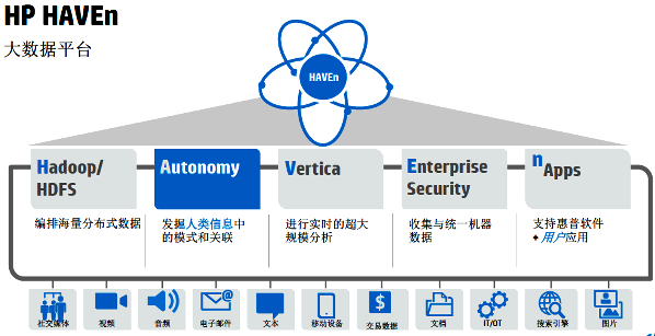 大数据分析是惠普公司重点战略之一,而惠普此前巨资收购的Autonomy则是惠普HAVEn大数据平台的重要组成部分。惠普软件集团Autonomy信息分析部副总裁兼总经理Rohit De Suaza来华接受ZDNet采访时表示,Autonomy可以输入和消化分析任何类型的数据,其中包括视频、音频、邮件、短信等非结构化数据和传统的结构化数据。这些输入的资料可以来自任何系统,包括摄像头等AV设备、微信微博等社交网络以及企业的传统ERP应用。Rohit披露,“驻阿美军就采用Autonomy系统进行分析,成功阻止了多起恐怖袭击。”
