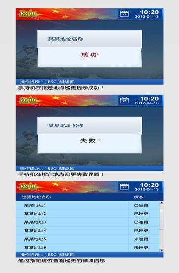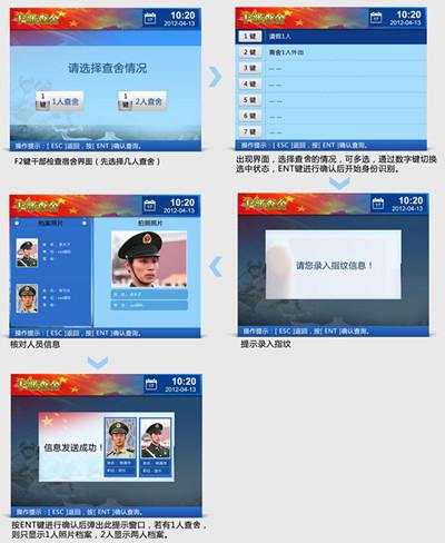 执勤查哨管理,查哨领导到达哨位后,根据终端设备的上岗信息,检查岗哨实际情况,并通过终端机将记录的岗哨情况提交至管理服务器,供相关人员查看。