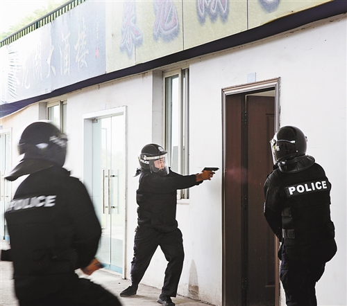 40名参训民警走进模拟街区,每5人一组,2人扮演成持刀或持枪的暴恐分子或进入商场,或躲进巷道,或藏身居民楼区,3人战斗小组按规定流程携带枪支到现场视情处置。