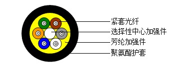 GYFJZU【非金属加强构件、紧套被覆、聚氨酯护套通信用野战光缆】光缆的结构是在单模或多模光纤外直接覆以高黏结强度的紧套材料制成紧套光纤,多根单模或多模紧套光纤外采用高强度的芳纶作为加强元件,外面挤上聚氨酯材料外护套构成。