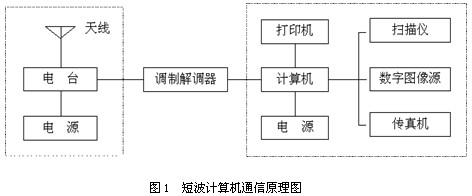 一个最基本的短波数据通信站由电台系统(包括电台、天线地线、电源以及自适应等选配设备)和计算机系统(包括计算机、各种外设、软件)构成,两大系统由调制解调器相连。主发站和接收站的构成是相同的。这一数据系统与有线数传的基本原理相同,只是利用电台搭建了一条无线数据通道,而不是通过有线线路。其原理如图1所示: