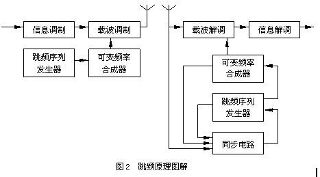 跳频是指载波频率在很宽的频带内按跳频图案(跳频序列)进行跳变,信息数据经信息调制变成带宽为B1的信号D后,进入载波调制。载波频率受跳频序列发生器控制,在带宽为B2的频带内随机跳变,实现信号带宽B1扩展到发射信号使用的带宽B2。可变频率合成器受跳频序列控制,使载波频率随跳频的序列值而改变。跳频信号经射频滤波器至天线发射后,被接收机接收。接收机首先从发射来的跳频信号中提取跳频同步信号,使本机跳频序列控制的频率跳变与接收到的跳频信号同步,得到被同步的本地载波,使载波解调获得携带有信息的信号D,从而得到发射机送来的信息。跳频通信的原理并不复杂。它是在普通无线电短波通信基础上增加一个“码控跳频器”。它的主要作用是使跳频通信发射的载波按一定规则的随机跳变序列发生变化。实现跳频通信的关键是,收发双方受伪随机码控制的、用来改变载频频率的本振频率必须严格同步。跳频伪随机码的改变可用微型计算机控制;改变计算机的程序,就可改变跳频的规律。跳频变化的方案不止一套,可以经常更换,所以要识破它就好比大海捞针,十分困难。