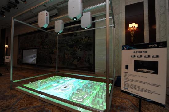此外现场展示的电子沙盘投影方案让人眼前一亮。了解发现,电子沙盘投影方案由4台爱普生CB-Z11000WNL工程投影机组成。其通过投影机内置的图形校正软件和工作站电脑软件,校正投影图像,将图像同实体模型尺寸完全重合,同时播放炫动的视频文件达到炫目的感觉,让参观者感受到实体模型的灵动感。