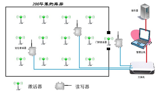 如图二所示,唐远电子给所有库房的枪支安装一个RFID半有源防拆卸电子标签,在没有授权的情况下拆卸标签,系统会发出报警信号;给库房里面布置一些低频激活器天线,用于定位,激活天线激活标签的距离为4米左右,即每一支天线可以激活半径为4米的圆面积,每支激活器天线都有唯一的地址码,用于定位,每台低频激活器带4支激活天线,激活器只需要供应12V电源即可;同时给房间里面安装2-3台读写器,该读写器可以和标签远距离通信,一般距离在60-80米,2-3台读写器可以完全覆盖库房所以区域,同时读写器可以通过RJ45,RS485等通信形式实时上传信号到管理主机,管理主机上面的管理软件,可以随时监控枪支的数量,进出库情况,实时盘点;还有,我们在库房门口放置一套低频激活器和读写器,用于门禁报警使用,当没有授权的枪支被带出门口的时候,系统检测到会报警;一般情况下,枪支放置在某个区域点位上,是不会移动的,如果在某时刻,某枪支从一个点位(激活器的某一天线)移动到另一个点位(激活器的另一天线),系统也会发出报警信号。
