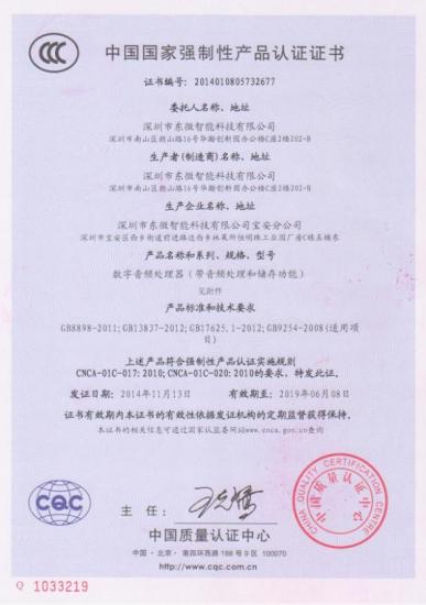 2014年11月13日,深圳市东微智能科技有限公司(以下简称“东微(TENDZONE)”)音频处理器产品通过中国强制性检验认证3C认证的检测及工厂审查工作,并获取中国质量认证中心所颁发产品质量认证证书(产品CCC证书)。