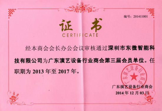 近日,广东演艺设备行业商会会长办公会审议通过“深圳市东微智能科技有限公司”为广东演艺设备行业商会第三届会员单位,并签订了《企业诚信守法经营承诺书》, 任职期为2013年至2017年。