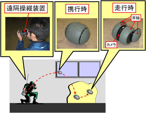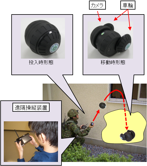 这种手投式侦察机器人具有可投掷、可移动和搜集情报3个基本功能。球形构造目的是确保在投入时不致损坏。2007年制成的首款侦察机器人缺点是分别置于正面、斜上方和后面的3个拍摄机因上下摇晃图像不清晰。而最新款机器人可以通过“变形”来使摄像机保持稳定,因此拍摄画面很清晰。