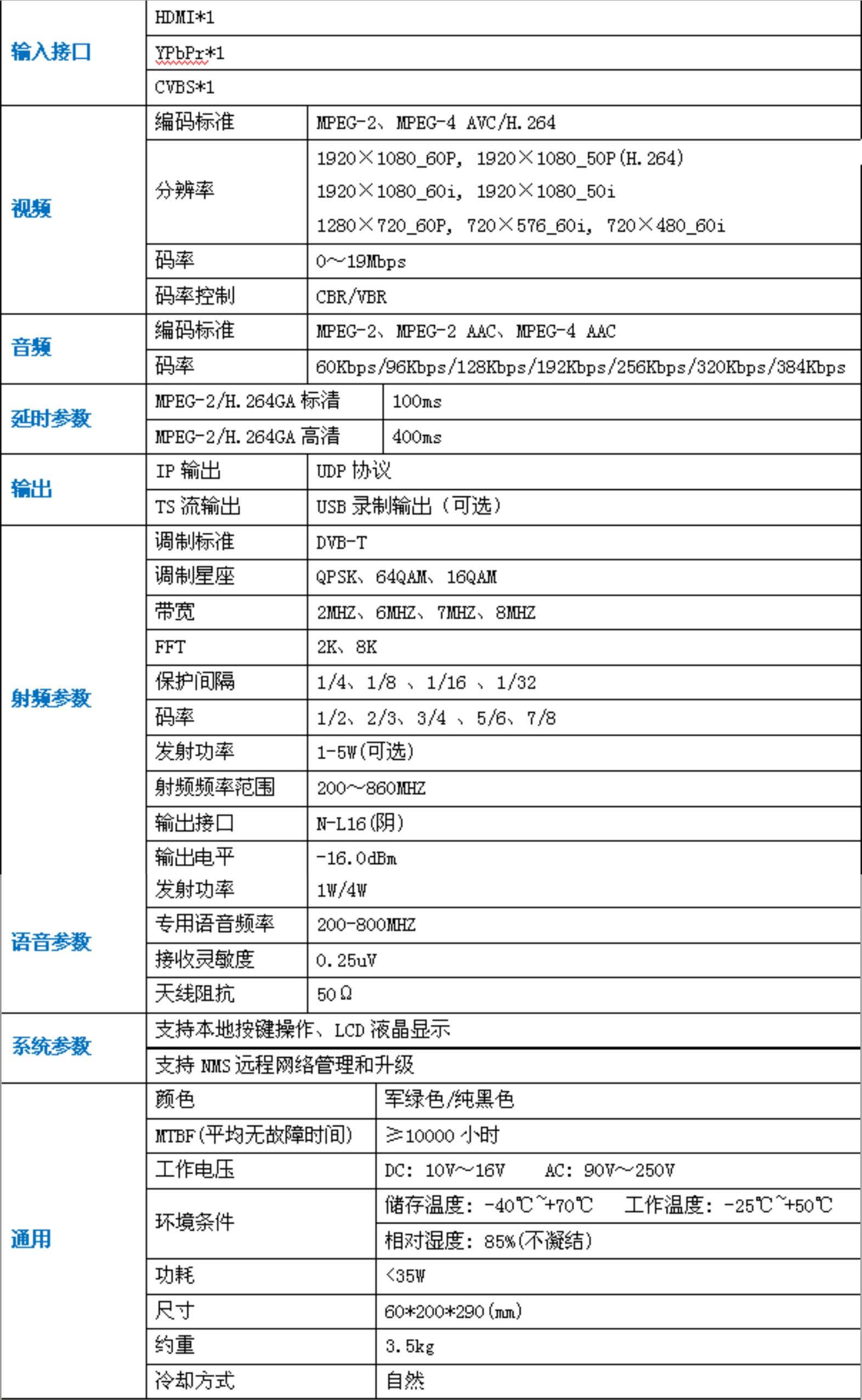 该单兵发射机集MPEG-2/H.264高、标清编码及DVB-T调制、发射功能于一体;支持HDMI、YPbPr、CVBS输入和IP输出(USB录制输出功能可选);输入信号经编码、调制后,直接经天线发射出去。