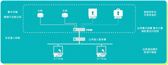 FMS由应用接入服务器(简称AAS)与软件系统相结合组成,软件系统部署在服务器上,如果有外带协作的需求,系统提供多人使用的“保密柜”以及单人使用的“保密包”产品,保密柜与保密包的功能与FMS系统相同。