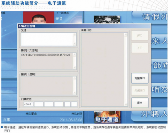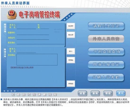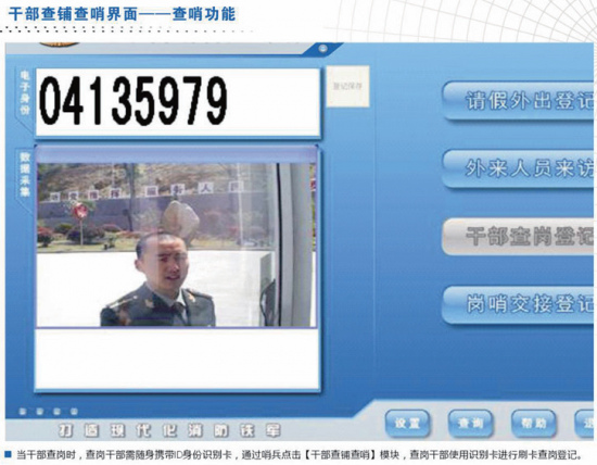 结合了数码拍照功能,对人员的出入、岗哨的交接、干部查岗等环节进行图片信息采集,个人身份识别卡与电子拍照功能的结合,进一步解决了日常营门岗哨的弊端问题;
