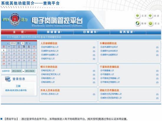 五是实现智能化营区巡查功能,此功能通过电子摄像头、指纹信息与系统结合,解决了部分岗哨巡查不到位、不巡查等问题;