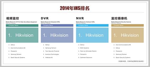 iHS报告指出,海康威视在多个类目中均排名第一,在快速发展的视频监控设备市场,海康威视更是在全球网络视频监控设备市场的份额达到了18.9%,相比去年的第二名,上升了5.9个百分点。报告同时也显现出公司在过去几年海外市场的突出表现,此次在EMEA市场(欧洲、中东、非洲)海康威视荣获了第二名的好成绩,达到了整体市场9.2%的占有率。