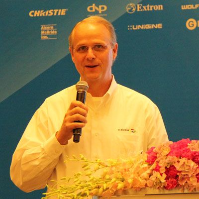 Scalable CEO Andrew Jamison先生介绍了Scalable不仅可以实现多台投影机自动融合,同时可以实现一键式重新校准,通过计算将变形图像投射于各种异形屏幕如弧幕、穹幕、球幕等,极大的节省人力和时间。