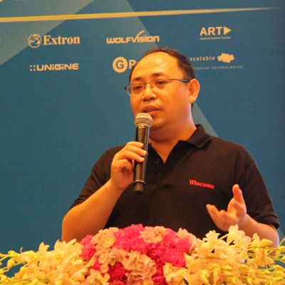 随后,科视中国区销售经理潘泉先生发表演讲,就科视品牌故事、案例、产品和技术进行分享,着重介绍了科视在加拿大拥有全球领先的工厂并在深圳也设立了专业工厂,同时介绍了科视不断创新,推出了全球最高流明亮度的投影机、最智能最轻巧的4K投影机,超短焦投影机,并大大扩充了单片DLP投影机阵营,投影产品线达到了XGA-4K分辨率,5000-45000流明,汞灯、氙灯、激光,短焦-长焦的全面覆盖。